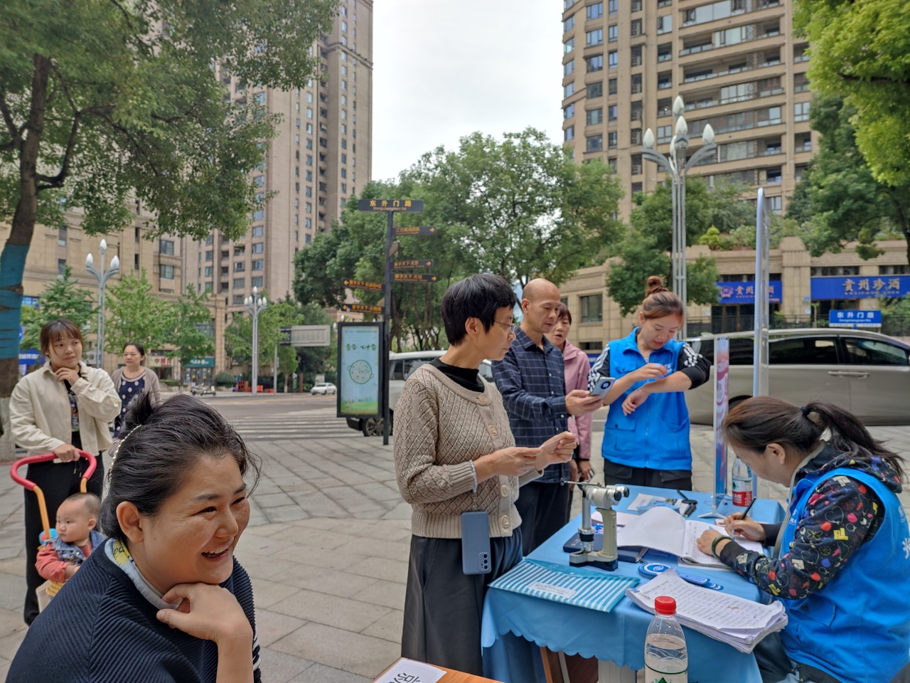 一位工友在路过时了解到可以免费测血压血糖于是坐下测试,医生测出他血糖临近正常范围最低值,赶紧提醒他:“你这个空腹血糖有点低了,赶紧去吃点东西,这附近都有吃的。”