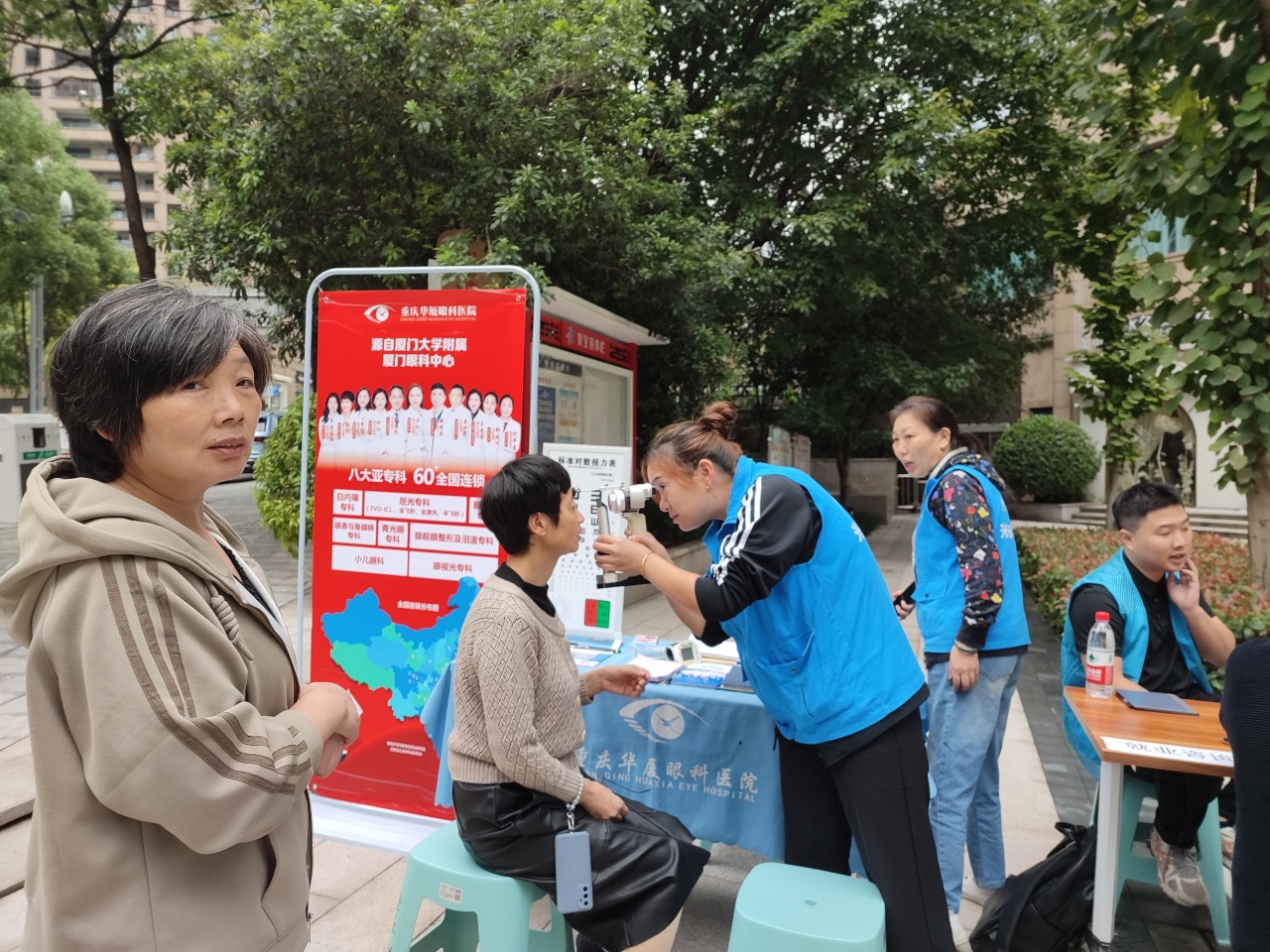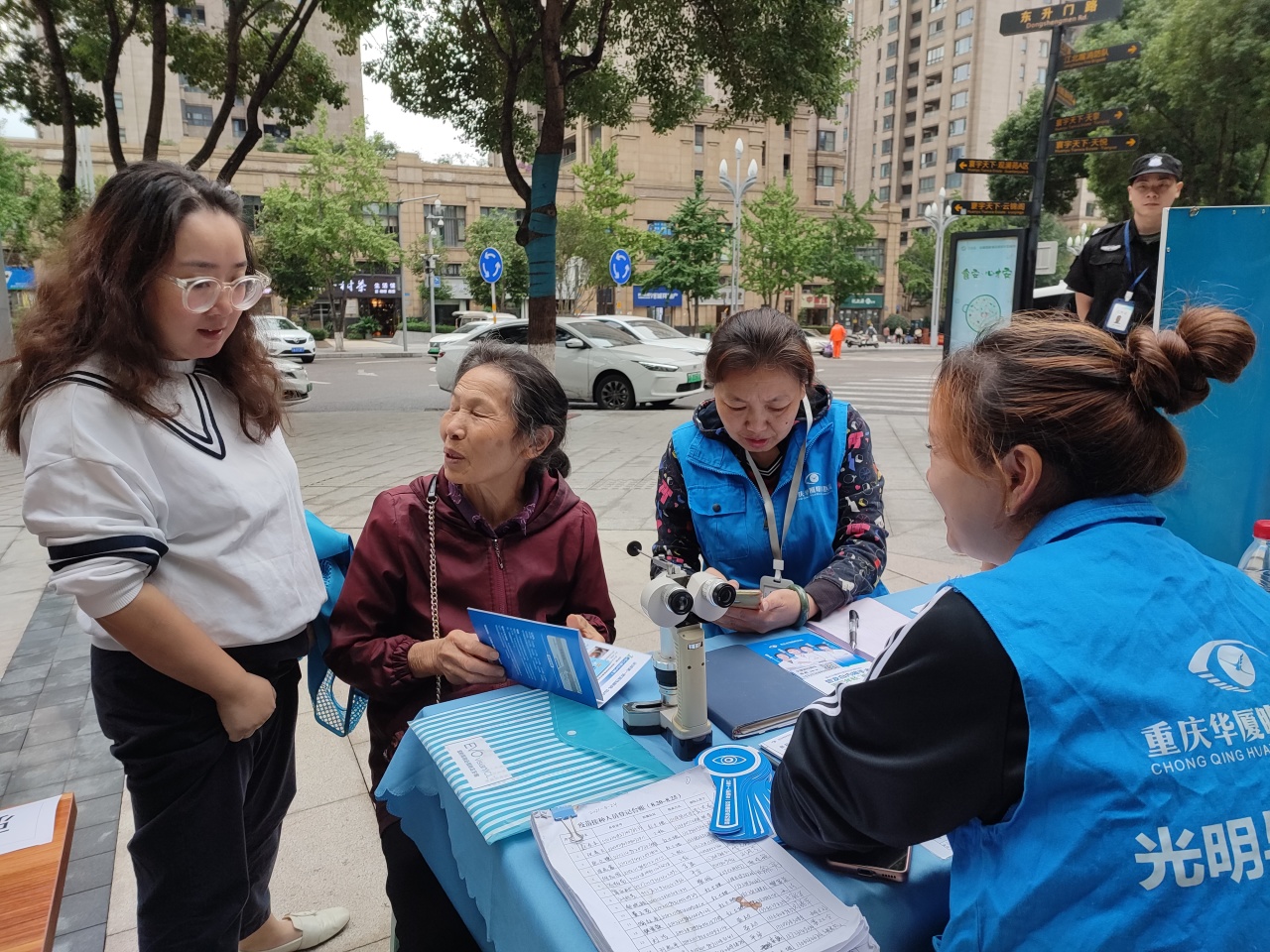 爱心医疗单位的医生耐心地为居民进行眼睛白内障检查与基础的视力测试,其中一位老大哥测出有5.0,同来朋友说:“你的视力原来这么好?我这个眼睛就比不得你,都是玩手机玩坏了。”