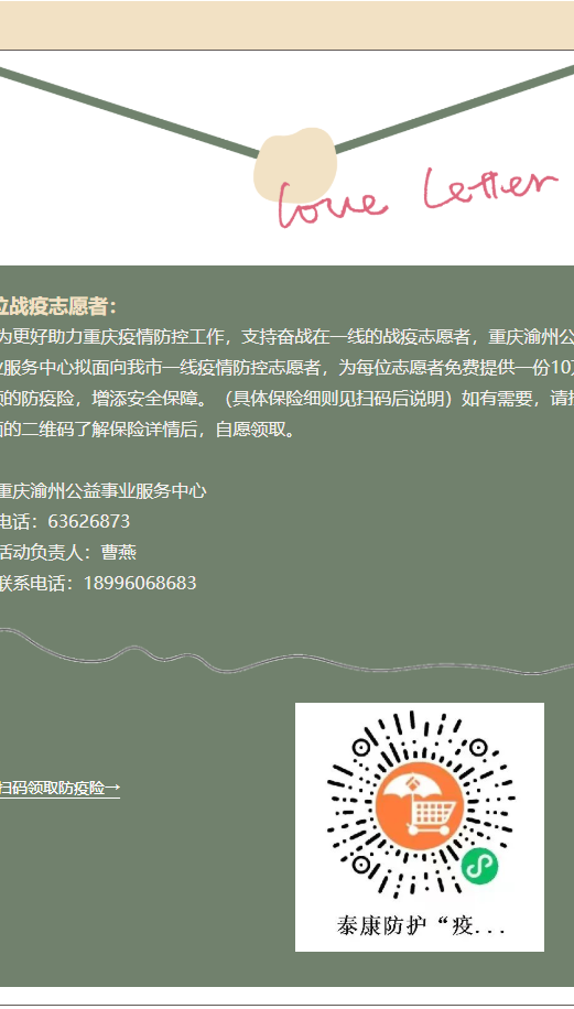 原来张先生通过重庆渝州公益事业服务中心的公众号,了解到渝州公益要为我市一线疫情防控志愿者们,免费提供一份10万保额的防疫险时,就要扫码投保,但是一直无法投保成功,于是电话咨询是什么情况。